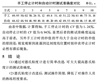 恩氏粘度計采用人工卡秒表的方式計時, 這樣就存在人為的操作誤差。 另外, 操作人員需用肉眼監視量瓶中流入漿液的液面是否到達刻度線位置, 以停止秒表計時 , 這也勢必存在著視覺誤差。 操作誤差和視覺誤差必然導致其測試準確度低。為盡量減小這些誤差, 操作人員需經過長期訓練, 而且**好能長期固定檢驗人員, 不同檢驗人員測得的數據的可比性較差。3 提高恩氏粘度計測試準確度的措施