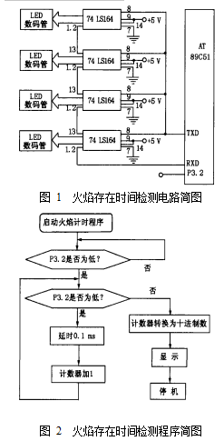 石油產品閃點溫度下的閃火火焰的存在時間是閃點檢測儀表電路設計的重要參數, 為測出火焰存在時間, 筆者利用 AT89C51 制成一臺火焰存在時間檢測裝置, 其電路簡圖如圖 1 所示, 主要流程圖如圖 2 所示。