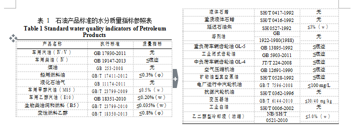 石油產(chǎn)品標(biāo)準(zhǔn)的水分質(zhì)量指標(biāo)見(jiàn)表 1。
