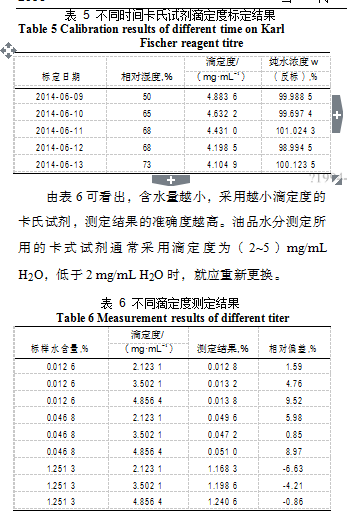 由表 5 可以看出,隨著時(shí)間的推移,卡氏試劑滴定度下降,是因?yàn)榭ㄊ显噭┦芸諝庵兴挠绊懀礈y(cè)試環(huán)境的濕度的增大。由于卡式試劑穩(wěn)定性隨時(shí)間不斷變化,所以測(cè)定新樣品時(shí),需要重新標(biāo)定滴定度,并用卡氏試劑循環(huán)沖洗滴定管。
